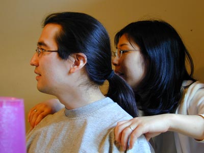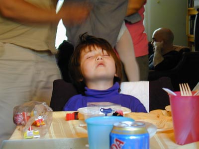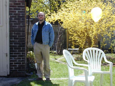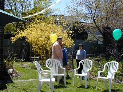 Kristen and the finally acquired and assembled patio set. Note the hour.