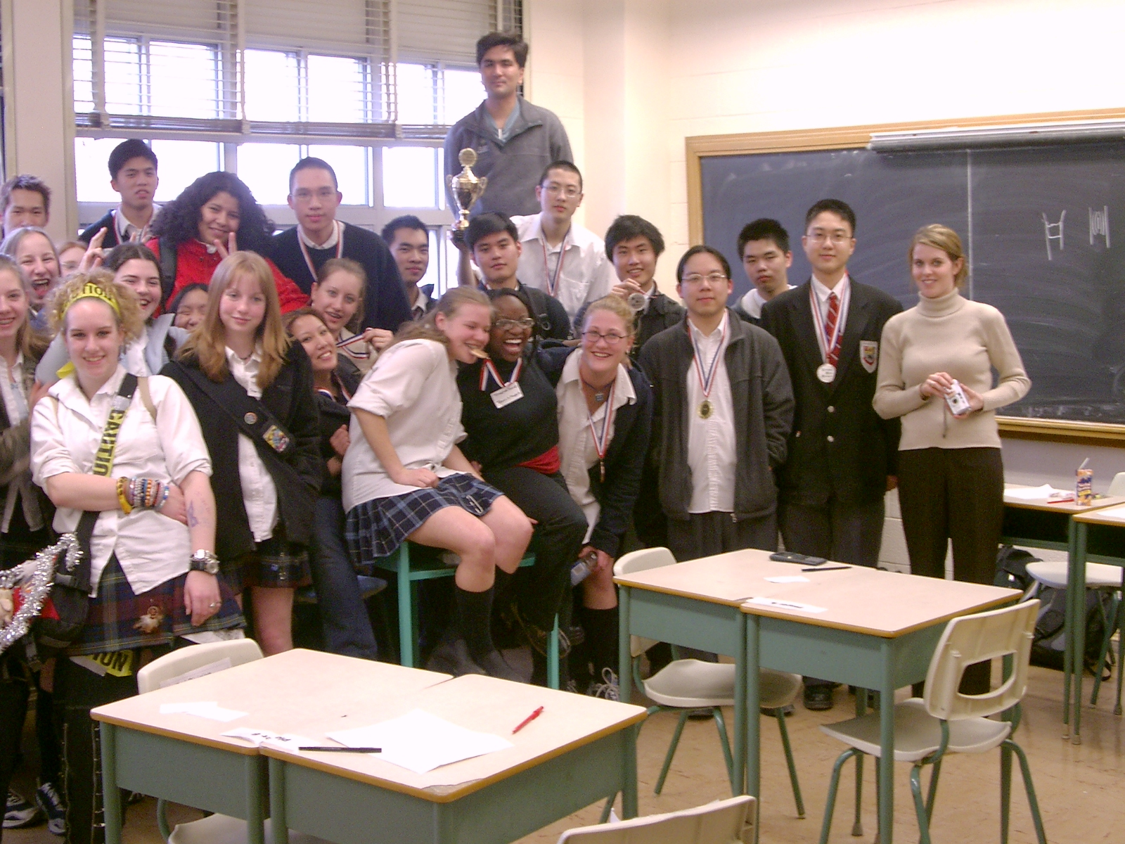On March 27th, 2003, Brebeuf College School hosted a team Scrabble tournament. Six teams of four competed, and the two home teams placed first and second. Through the generosity of its members, the Toronto Scrabble Club provided all the equipment for the event, including boards, tiles, bags, racks and clocks.